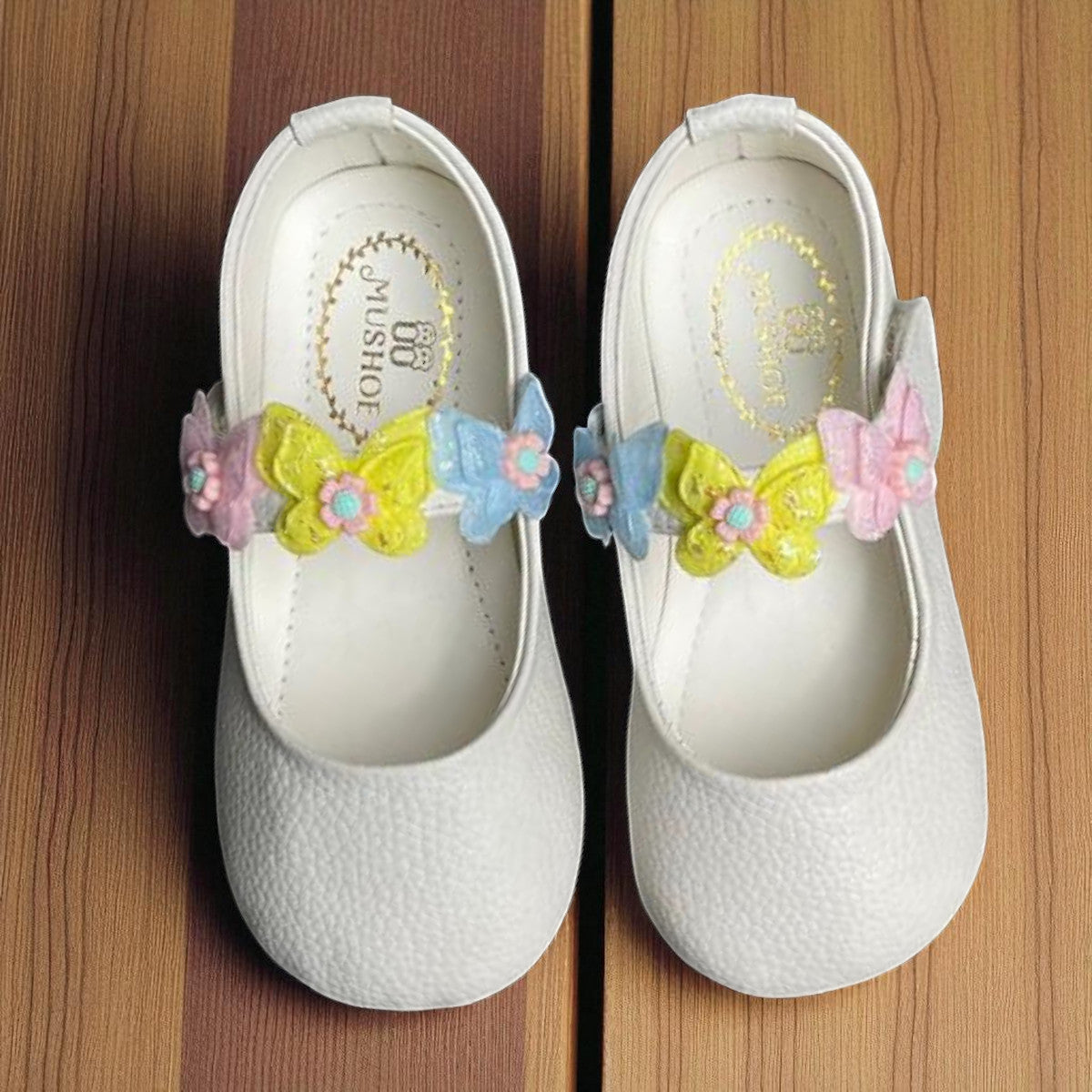 These black and white bellies for girls designed just for little girls. With their soft, round-toe front. The real magic lies in the delightful 3D butterfly accents adorning the strap—delicately crafted in pastel shades of pink, yellow, blue, and green, each one topped with a cute little beaded flower. Finished with a secure Velcro strap, these girls belly are easy to slip on and off, making them perfect for playdates, parties, and everything in between.