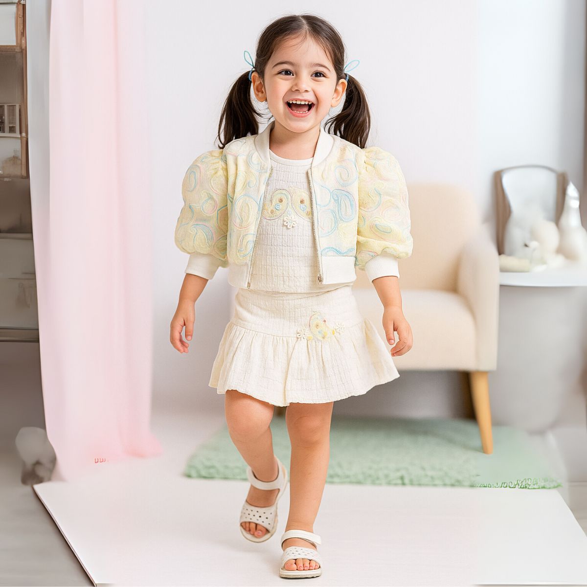 Style your little one in this trendy embroidered skirt and top set, available in black and cream. The outfit features a puff-sleeve jacket with colorful embroidery, a chic top, and a matching skirt with delicate floral motifs. Perfect for parties, festive events, and special outings, this set blends comfort with fashionable charm for your princess.