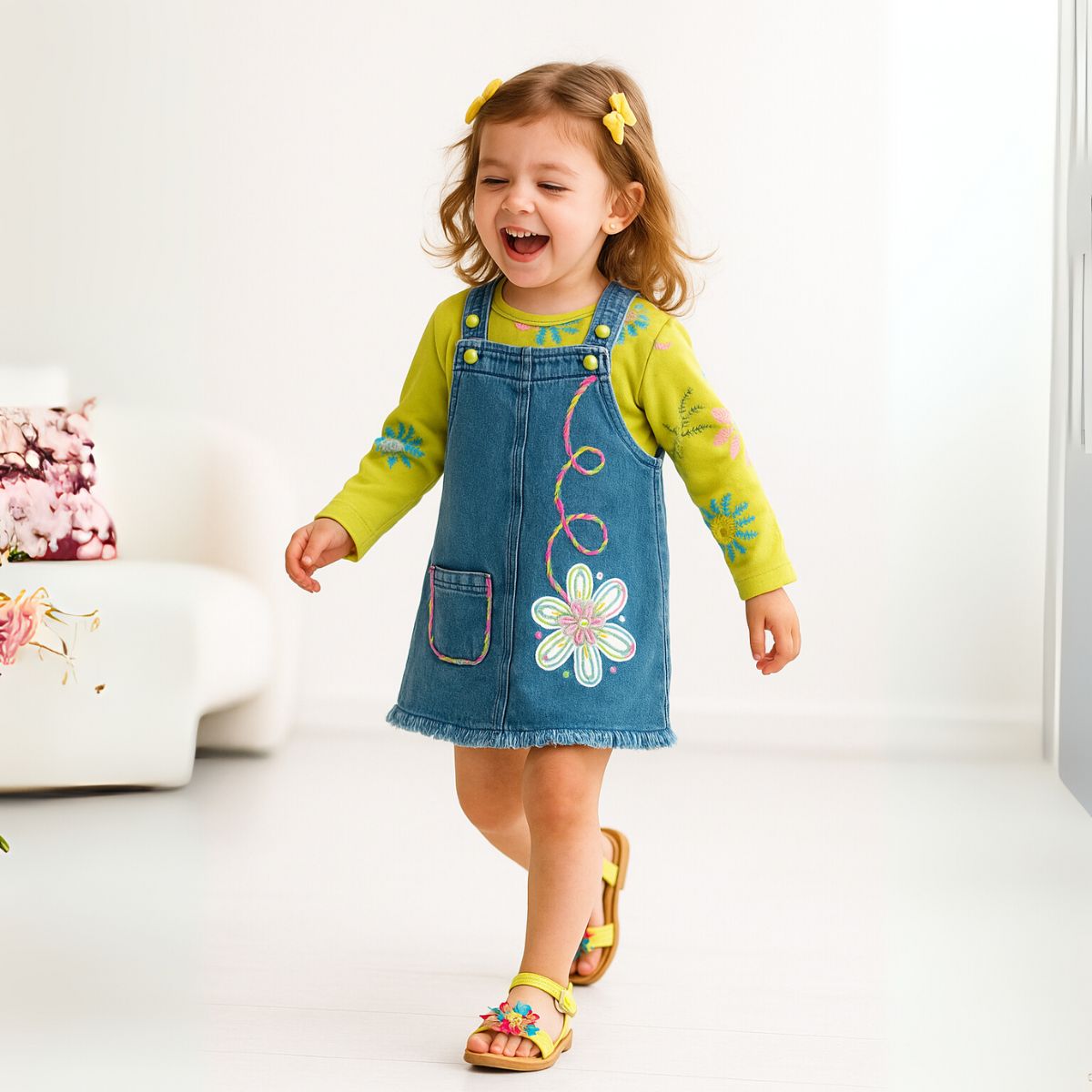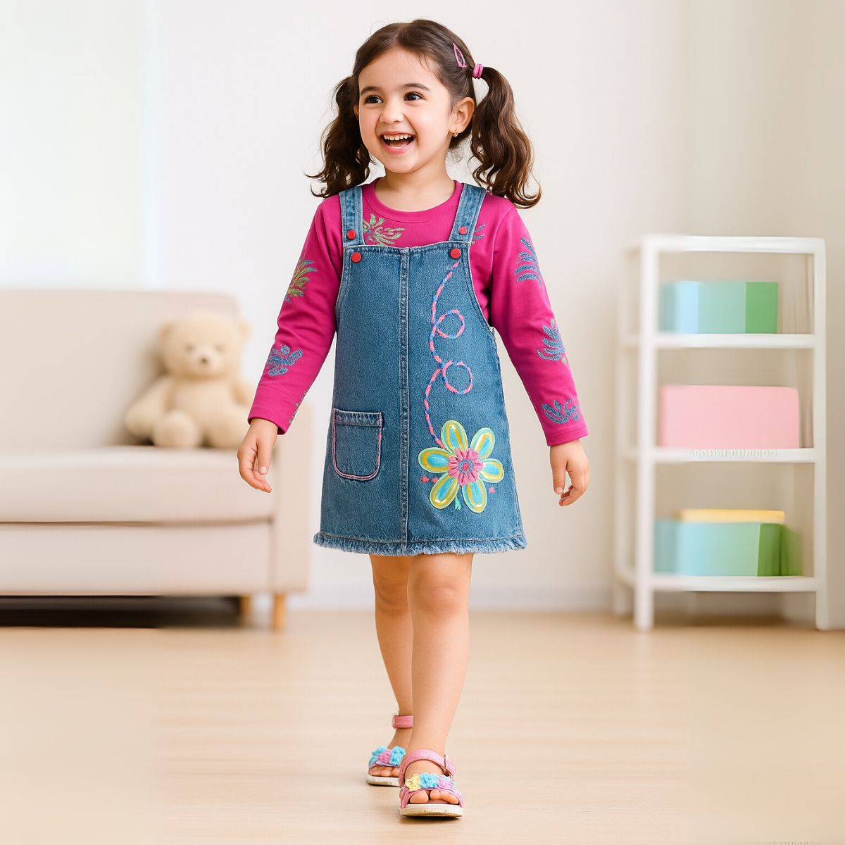 This denim girls midi is available in mustard and rani shades. Designed with colorful floral embroidery, front pocket, and frayed hem for a stylish touch, it comes with a soft full-sleeve inner top for all-day comfort. Perfect for casual outings, playdates, and festive gatherings, this outfit blends charm with everyday wearability.