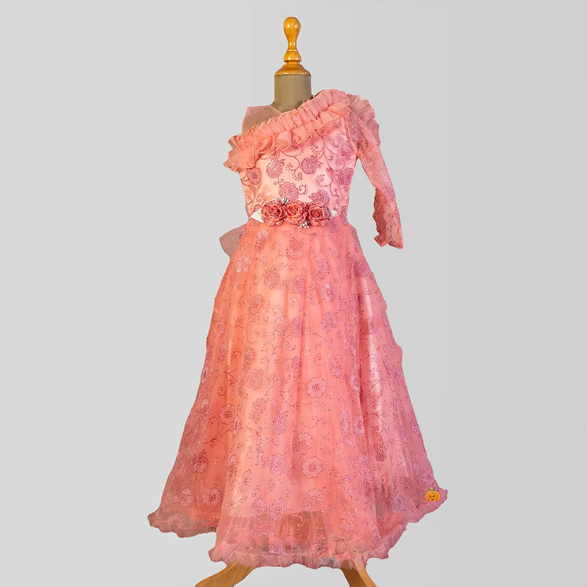 One sleeve floral patterns girls gown with frill design in grey and peach colors. The kids gown features a layered style on the backside and a flower at the waist.