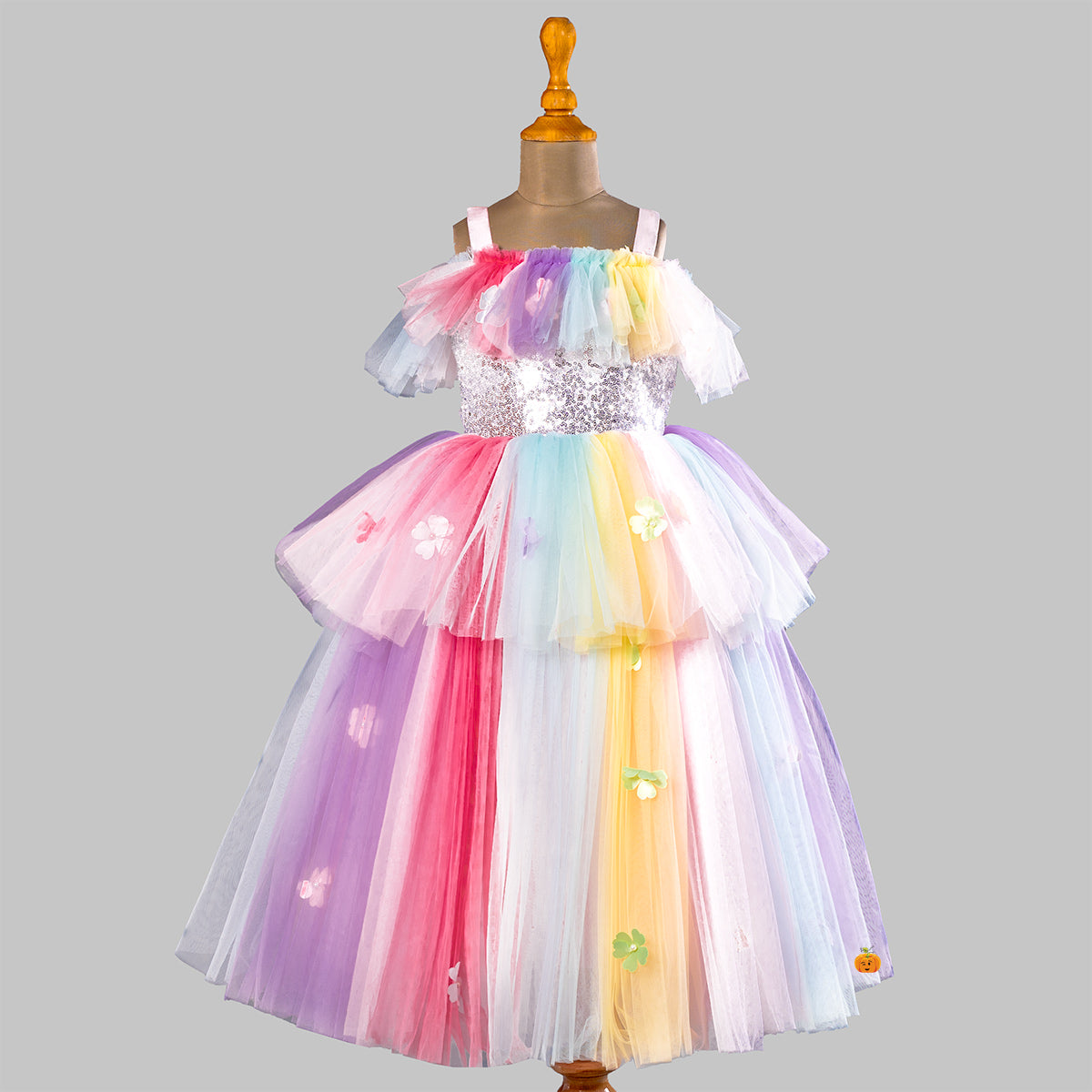A Layered girlish gown with an off-shoulder pattern. This gown for girls has a long net and scattered flower detailing on it. While the multi-color pattern gives it a playful and fun vibe.