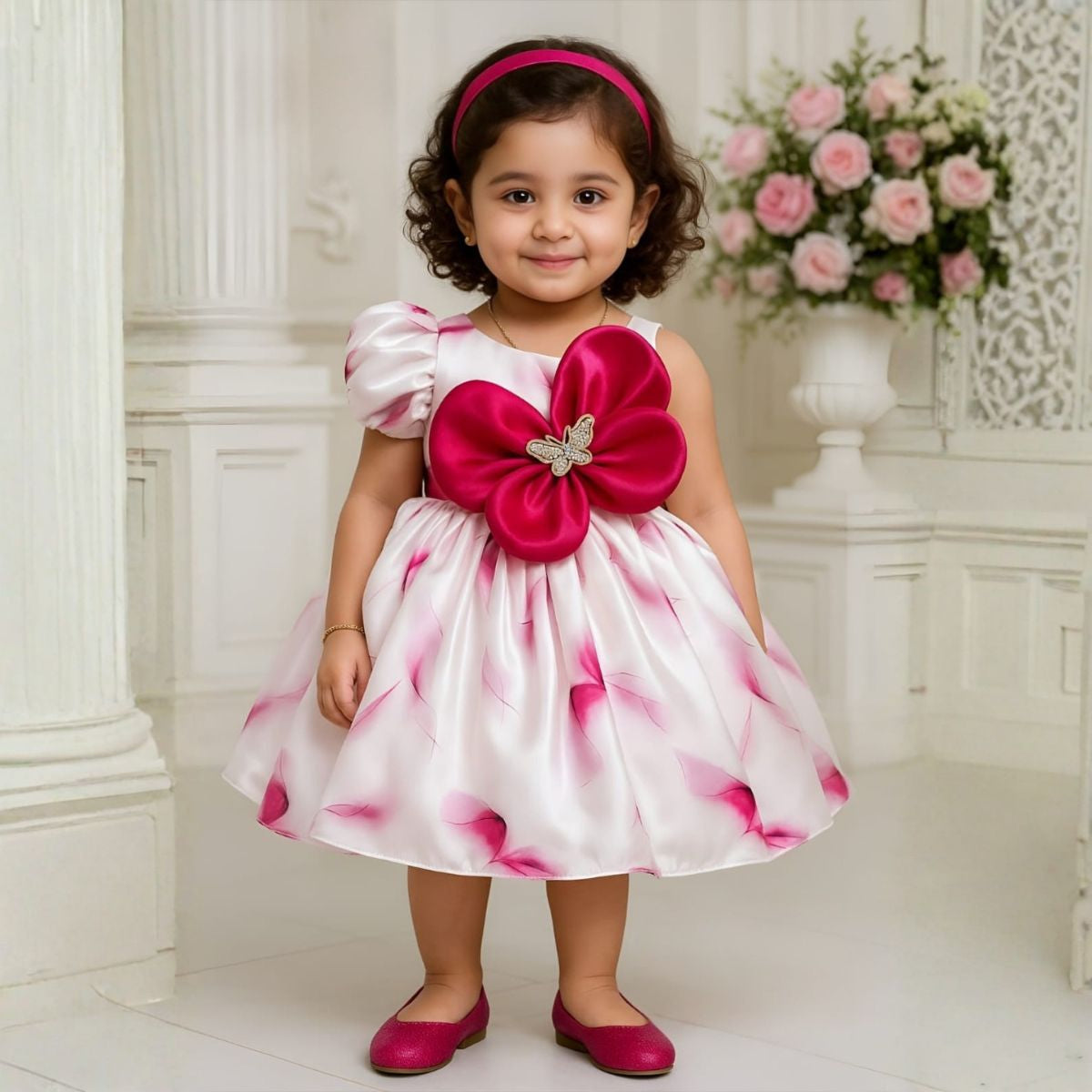 Delightful and dreamy — this frock for girls blends soft blue or purple hues with a striking oversized petal applique at the waist. The sleeveless bodice, light flared skirt, and delicate floral print make it perfect for birthdays, parties, or festive occasions. Comfortable for all-day wear and ideal for photo-worthy moments.