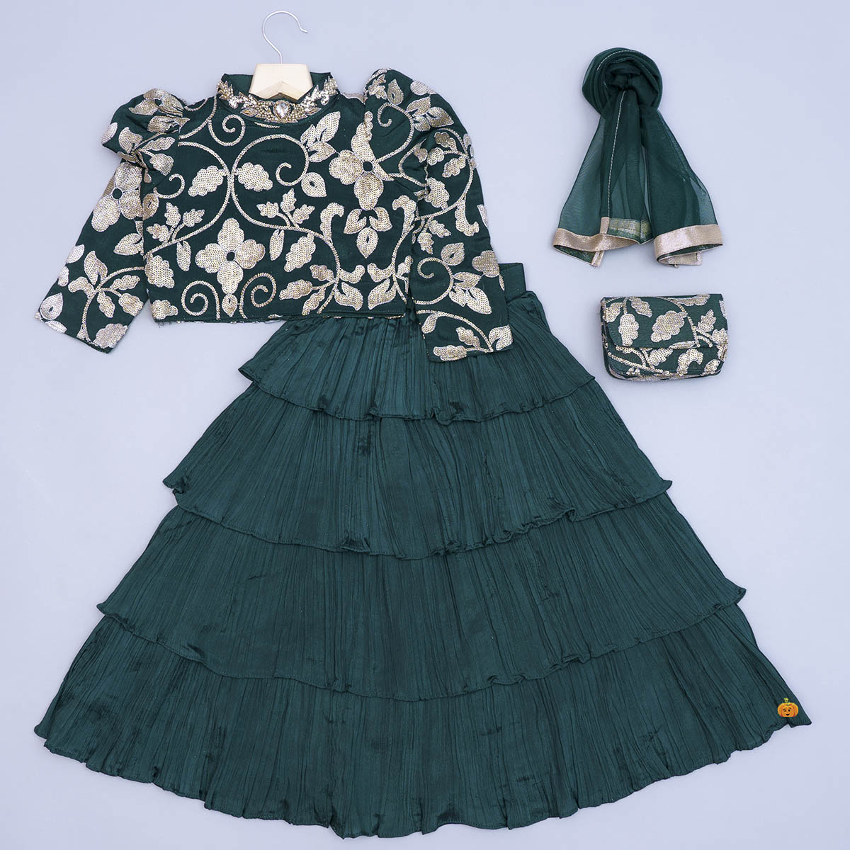 Style your little one in this trendy embroidered skirt and top set, available in black and cream. The outfit features a puff-sleeve jacket with colorful embroidery, a chic top, and a matching skirt with delicate floral motifs. Perfect for parties, festive events, and special outings, this set blends comfort with fashionable charm for your princess.